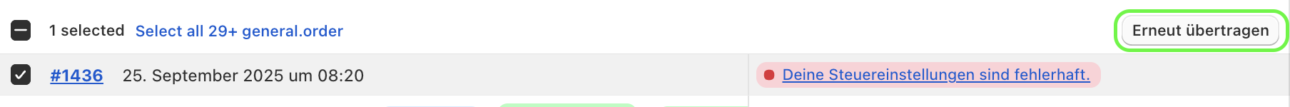Belege werden direkt im Übertragungslog mit einem Fehlerhinweis gespeichert sobald es Unstimmigkeiten bei deinen Steuereinstellungen und den Bestelldaten gibt. So kannst du den Fehler gezielt beheben und die Übertragung neu starten.